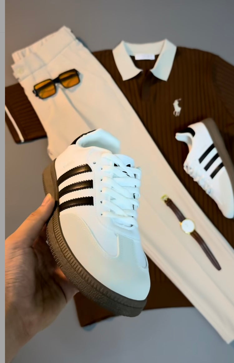 Perfect Combo: T Shirt, Pants & Sneakers& Watch "التركيبة المثالية: قميص، بنطال وأحذية رياضية!" – White & Brown Combo